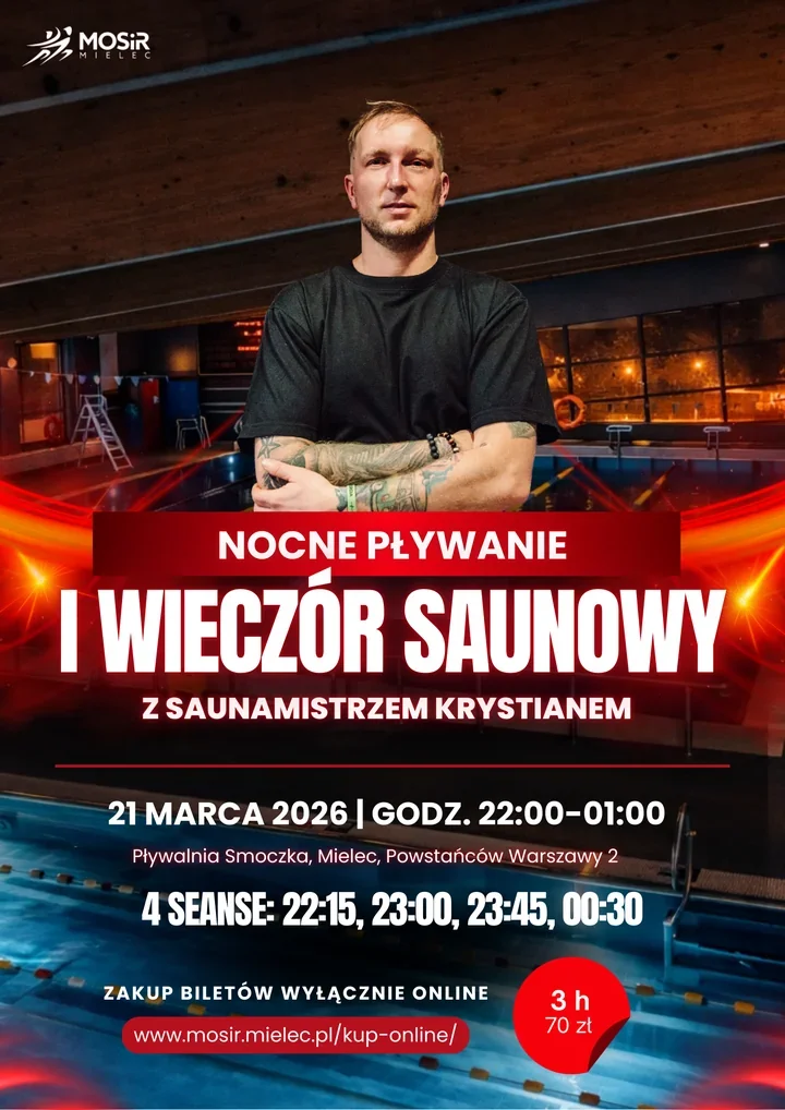 Ogólna ramówka wydarzenia jest prosta i klarowna - trzy godziny nocnego relaksu. Szczegóły do zapamiętania: 21 marca w godzinach 22:00–1:00, miejsce - Pływalnia Smoczka (MOSiR Mielec). Wstęp kosztuje 70 zł / osoba. Bilety można kupić online pod adresem https://mosir.mielec.pl/kup-online/.